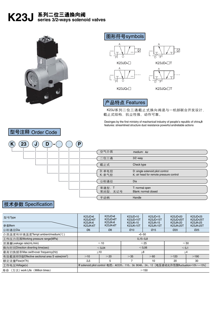 K23J系列 二位三通截止式換向閥 產(chǎn)品特點(diǎn): K23J系列二位三通截止式換向閥是一機(jī)部換向閥聯(lián)合設(shè)計,具有結(jié)構(gòu)合理動作可靠特點(diǎn)。